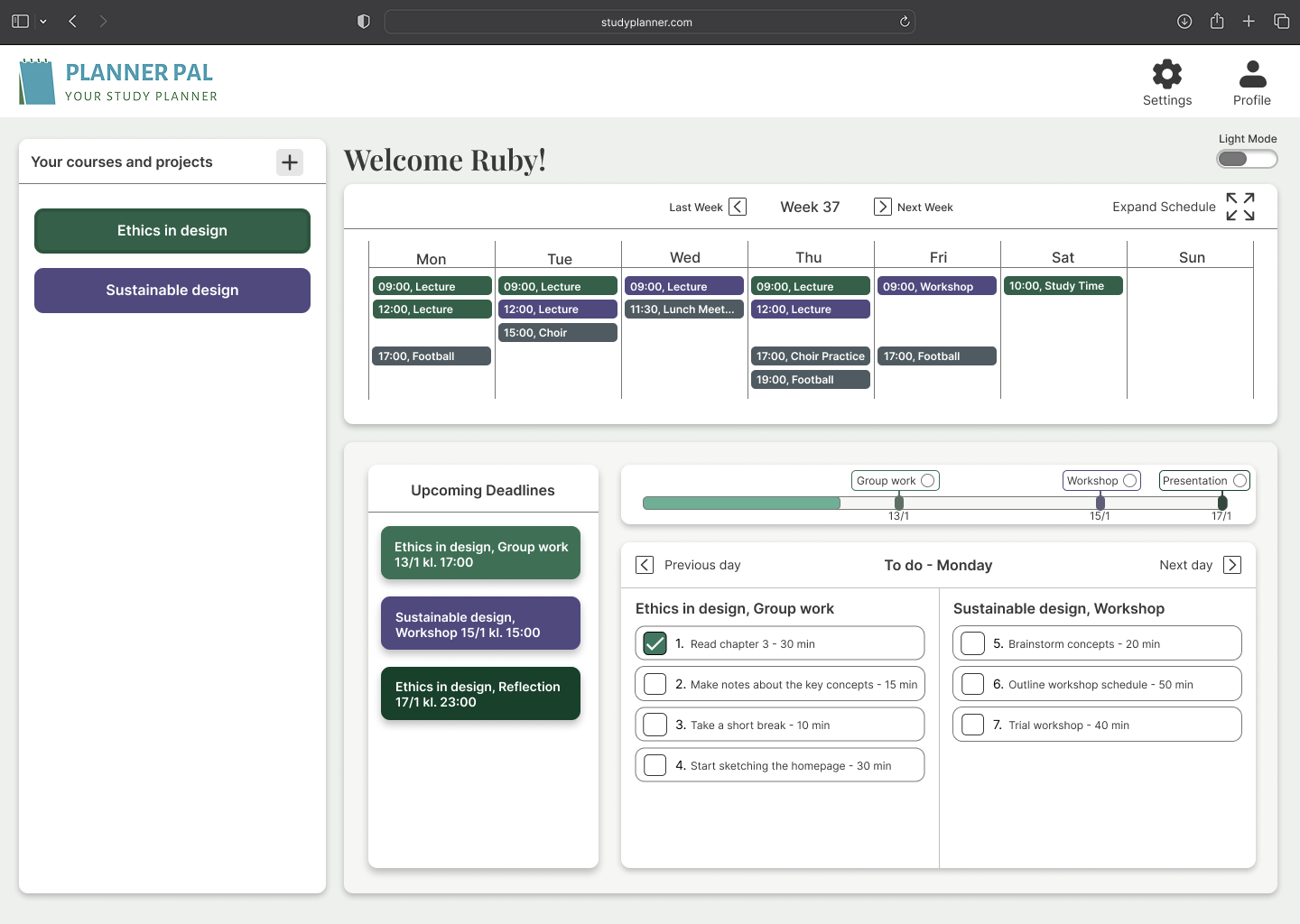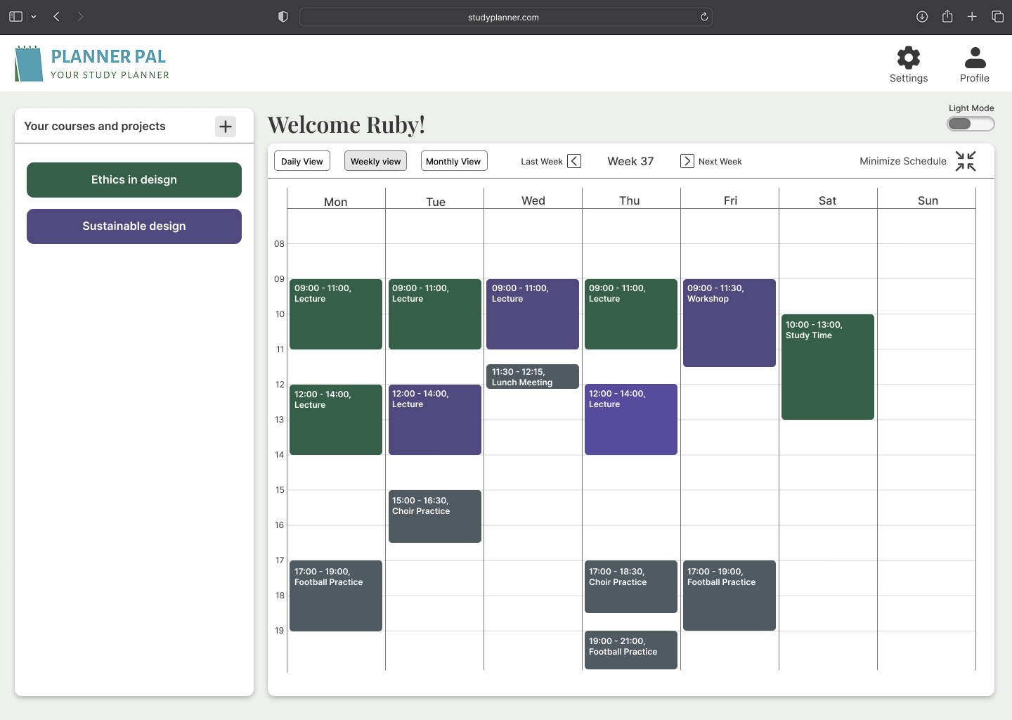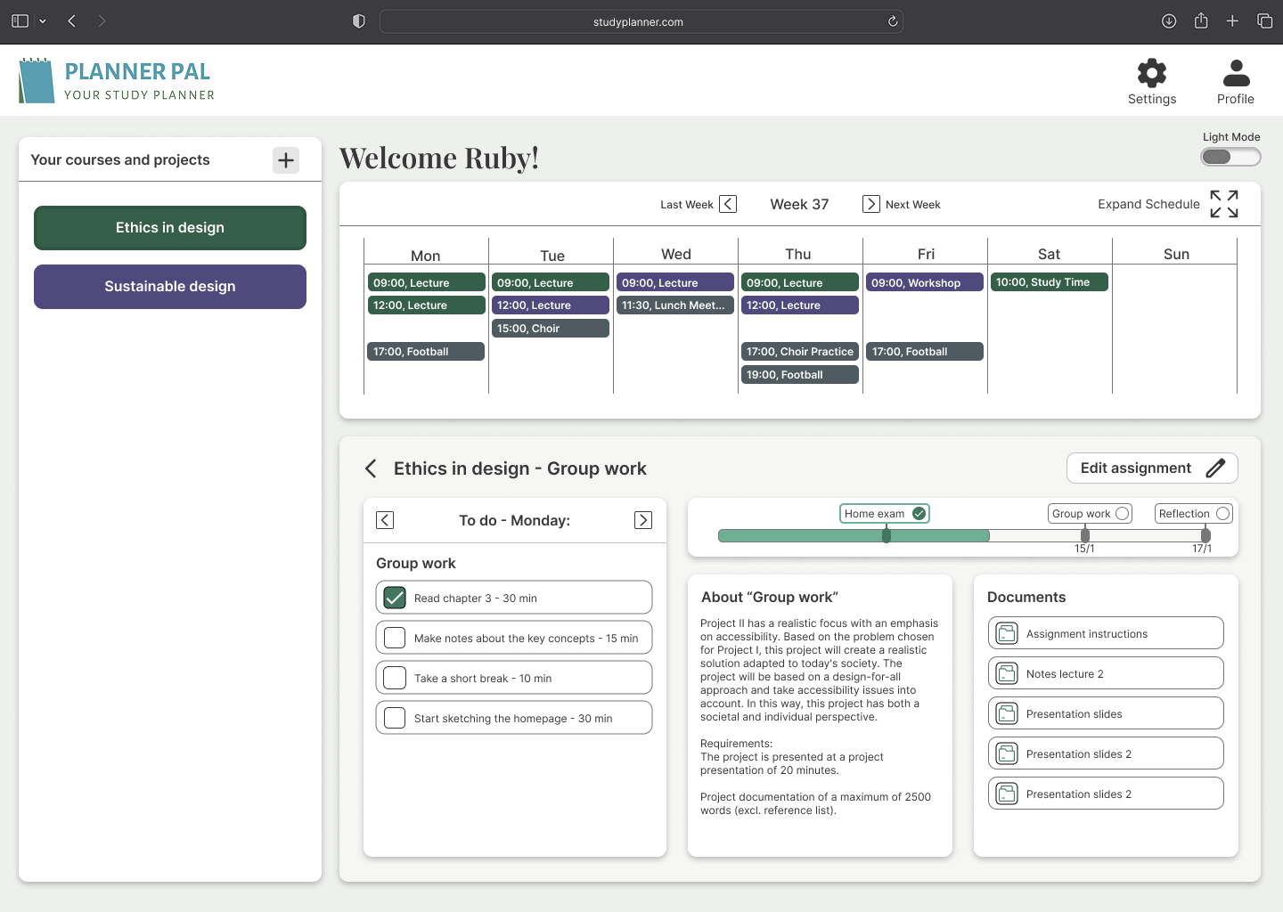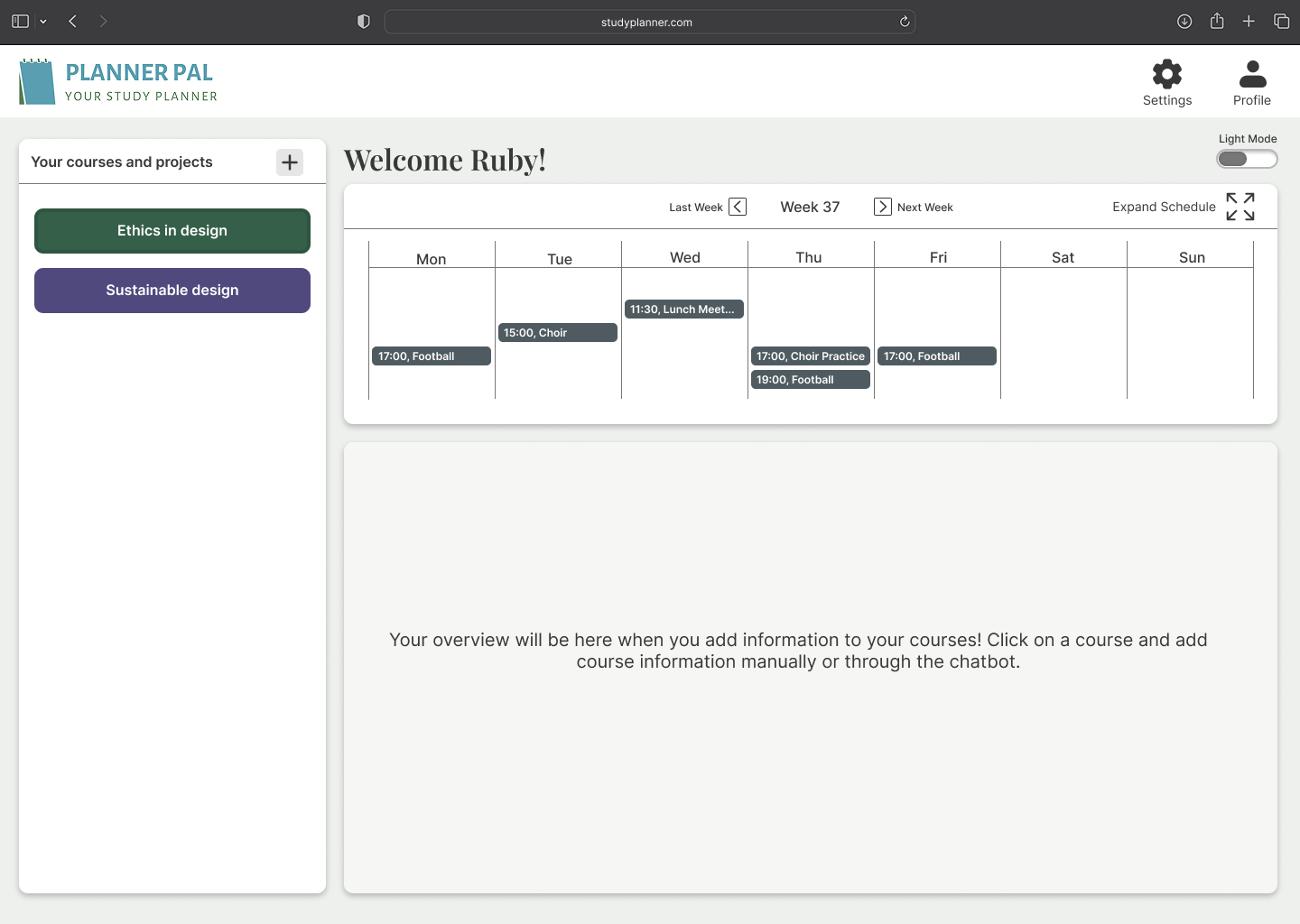 We also explored how Planner Pal could exist as a browser extension, providing a more compact and immediately accessible version of the tool. This allows students to check deadlines, tasks, and key planning information without leaving their current study context, and reduces the need to navigate a full interface when that creates unnecessary friction.